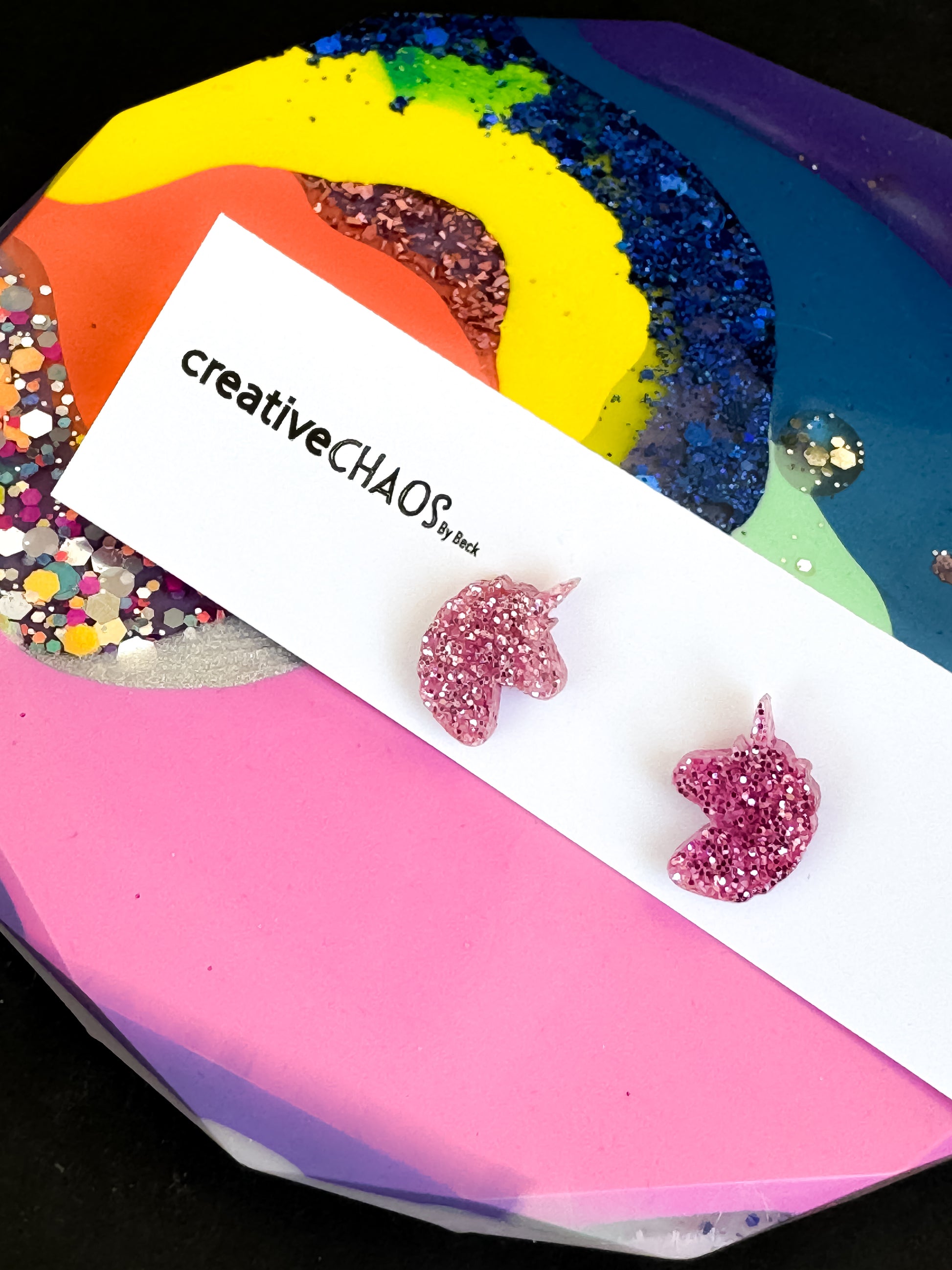 Enchanting Pink Unicorn Stud Earrings with Silver Glitter