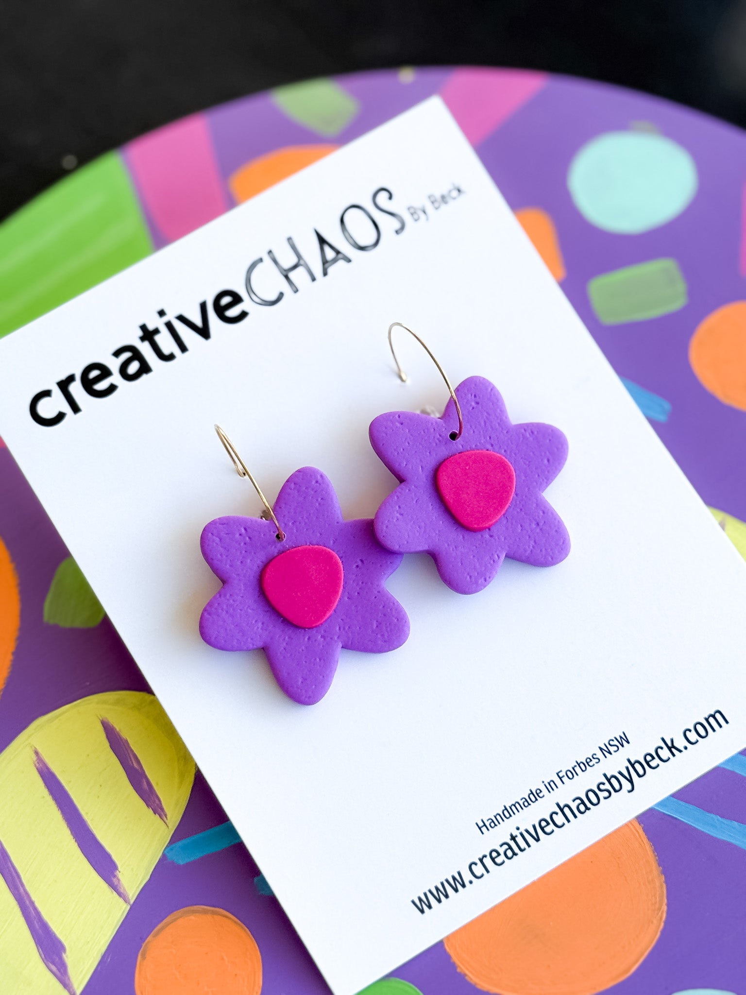 Handmade Polymer Clay Flower Dangle Earrings on Gold Hoop